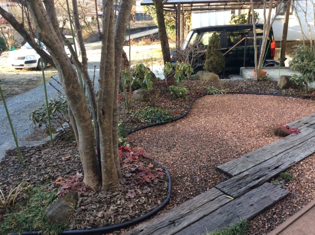 雑草対策とお庭づくりをお手伝いさせて頂きました飯田市のM様。弊社がお庭を造り4~5年経ちます。剪定のメンテナンスをご依頼されてますが、瓦チップ敷き(中央)とウッドチップ敷き(左側植栽中)はきれいにM様が管理されています。ウッドチップ、防草シート敷き瓦チップも日々メンテナンスの手助けになっています。