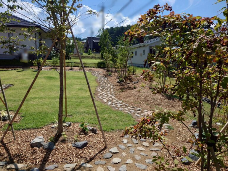 お庭を作りながら楽しみたいとのことで、ご自身でできる部分はDIYでやってみては?とご提案したのが、石を並べて舗装するあられこぼしです。芝や植栽はやらせていただき、通路の部分をご自身で造ってゆくということに。材料の石材をお届けしました。ご自身で造ってゆくお庭は愛着もひとしおかと思います。