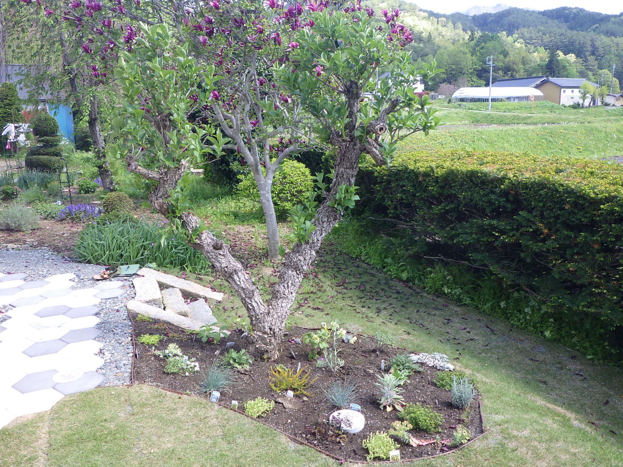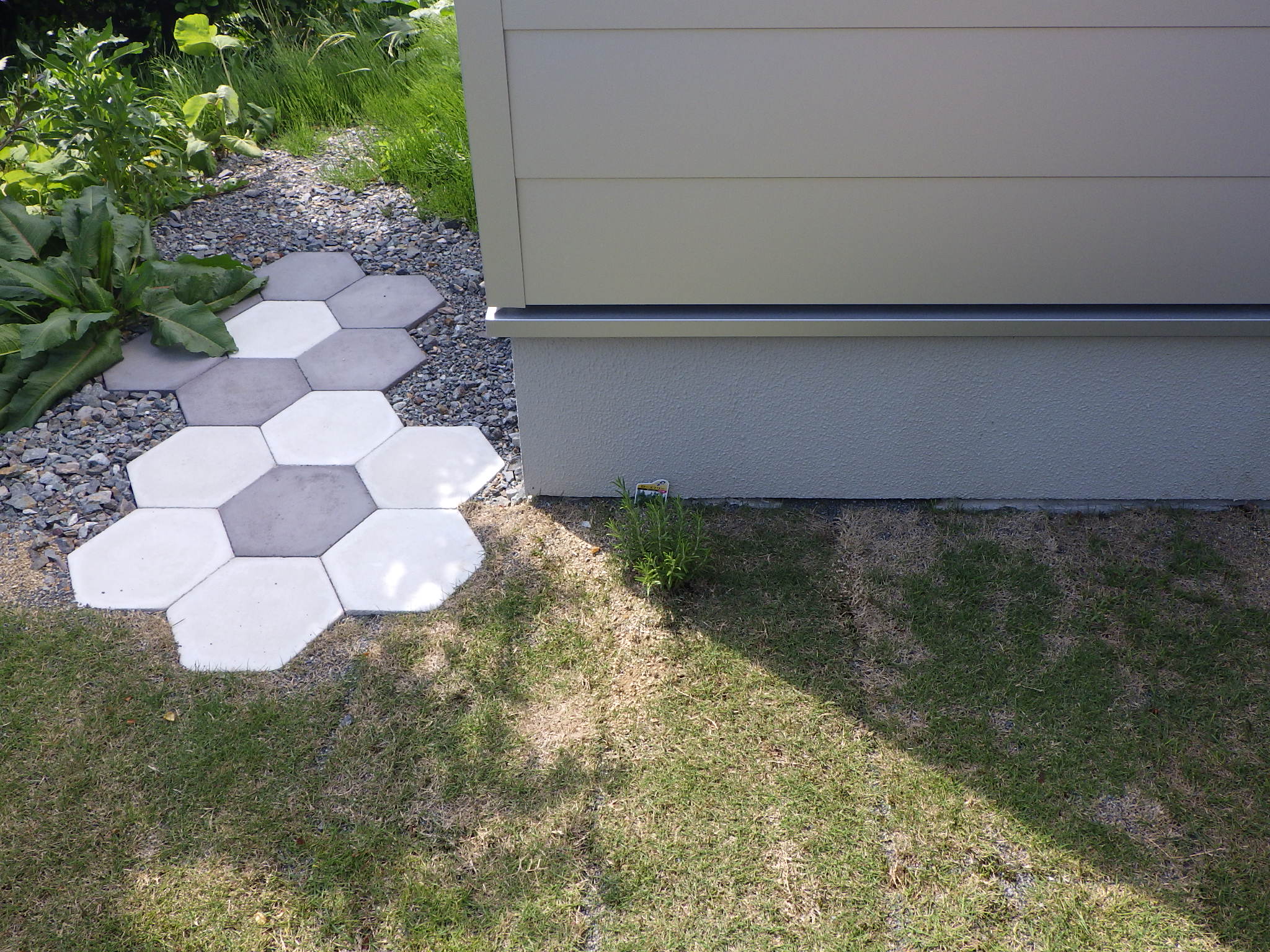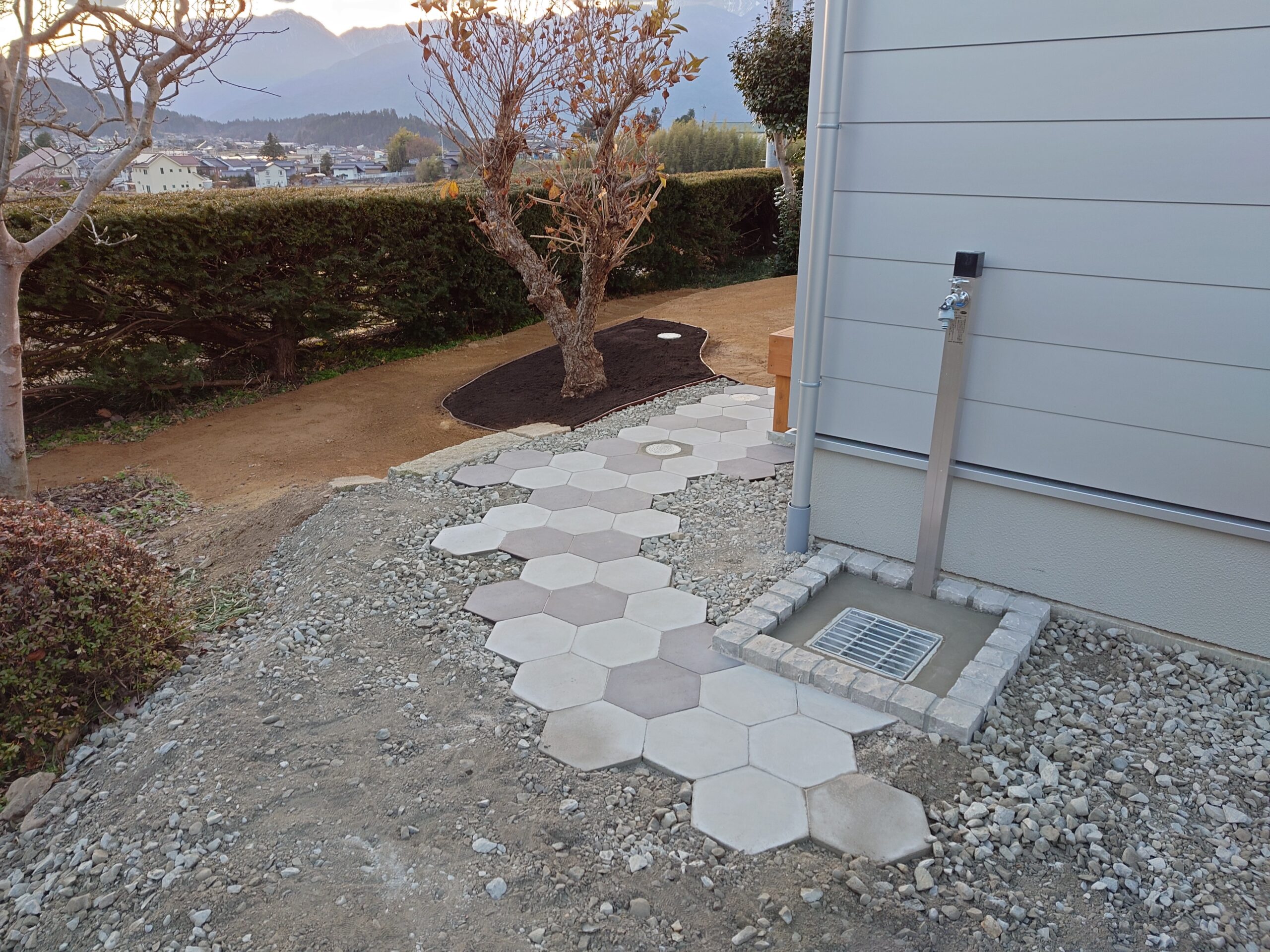 現地調査の際、昔のお家の土台石があったので、敷地の段差を利用し、ミニ階段を作り、まだハイハイのお子様が成長し遊べるようにと、お庭のポイントの一つとなるようにしました。アプローチにはお施主様がカタログを見て気に入られた、6角形ブロックをお子様とけんけんぱできるように色を選び模様にしました。芝のお庭はテントが張れるように平らな部分をできる限りとれるように造成しました。